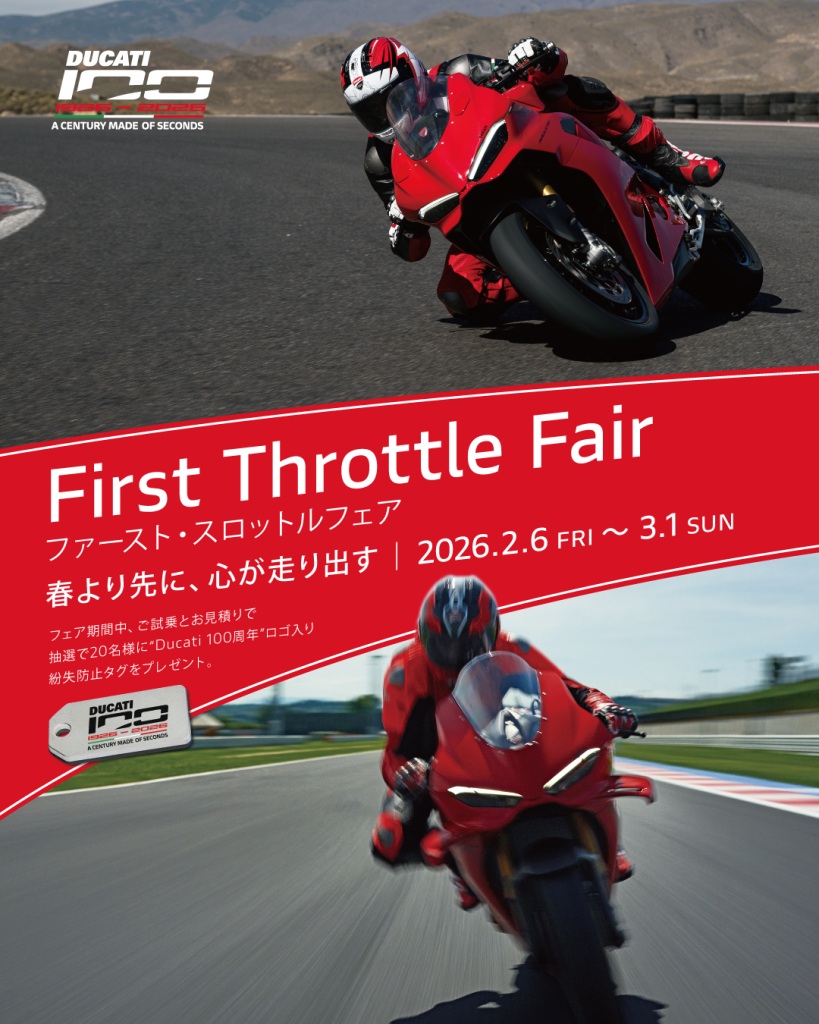 — 春より先に、心が走り出す — ドゥカティは100周年という大きな節目を迎えました。この特別な年の幕開けを記念し、ドゥカティの世界をご体感いただける「ファースト・スロットルフェア」を開催いたします。